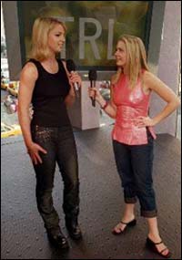 Spears, left, and actress Melissa Joan Hart stand together in MTV studios above New York's Times Square while guest-hosting the popular show "Total Request Live," Sept. 28, 1999.